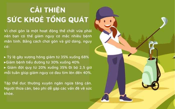 Golf là một môn thể thao có nhiều lợi ích cho sức khỏe, bao gồm: